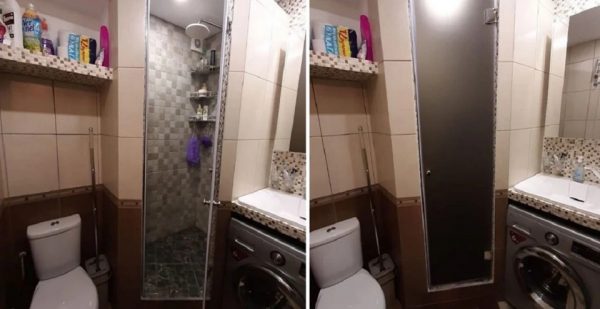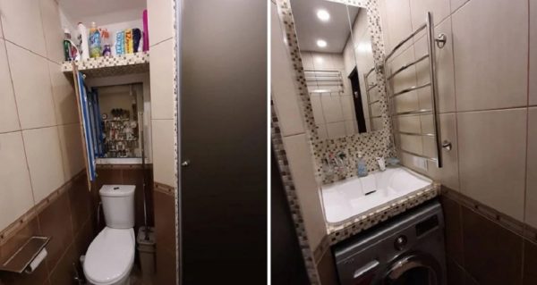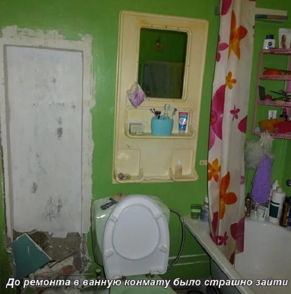 Особым «шармом» в домах советской застройки эпохи Хрущёва отличались санузлы. Будучи совмещёнными, они при этом выходили тесными. Раздельным исполнением могли похвастаться разве что трёхкомнатные квартиры. Площадь туалета и ванной была минимальной и не предполагала установка современной бытовой техники, например, стиральной машины. В нашем случае стены секции были выложены в половину силикатного кирпича. Сверху был наброшен массивный слой штукатурки. На уровне человеческого роста его толщина была примерно в два раза толще, чем в верхней части комнаты Финишное покрытие — обычная масляная краска, щедро нанесённая на стену в несколько слоёв. Светло-зелёный цвет вызывал ассоциации с комбинезонами хим. защиты на учениях по гражданской обороне времён Карибского кризиса. Зато дёшево и эстетично.
