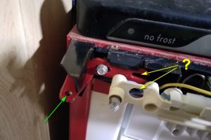 Как видно, на этом же среднем кронштейне осталась ось, смотрящая вертикально вверх – на нее будет насаживаться верхняя дверца морозильной камеры.
