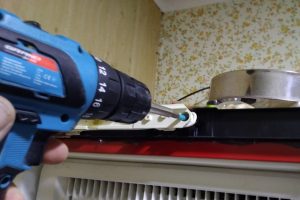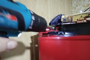Устанавливаю на место и фиксирую двумя саморезами пластиковый блок – рамку с потенциометром и лампочкой-индикатором.