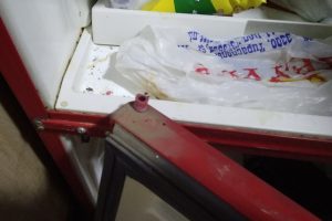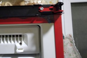 Дверь холодильного отсека снизу опирается на кронштейн, который фиксируется к корпусу холодильника четырьмя крепёжными деталями. Как выяснилось после снятия – это саморезы разных диаметров.