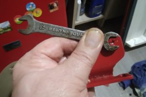 Ось была пробрызгана ранее «WD-40», успела откиснуть, и довольно легко отверткой стронулась с места, а затем – и полностью выкрутилась.