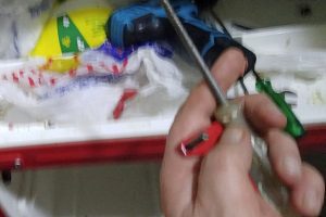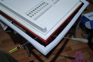 Значит, первым делом необходимо немного приподнять один из углов – расклиниваю его двумя подсунутыми отвертками.