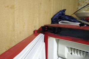 Пока не установлен блок с регулятором режимов работы и декоративный козырёк, имеется возможность проверить, хорошо ли прилегает уплотнитель к корпусу холодильника по верхней линии двери.