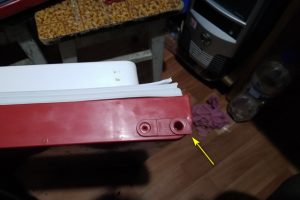 Больше всего опасений вызывал как раз процесс демонтажа дверей. Если с нижним и средним кронштейном-подвесом все относительно понятно, то верхний – скрывается под декоративным колпаком. В некоторых моделях холодильников, судя по выложенным видеороликам, для того чтобы добраться к креплениям, приходится даже снимать верхнюю крышку агрегата. Были и у меня такие крамольные мысли, так как никаких видимых креплений не обнаружил. Хорошо, что попалась маленькая подсказка на одном из форумов – все оказалось значительно проще.