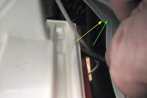 Поначалу думал, что здесь, также как и на остальных дверцах (как показано в видео-инструкции) уплотнить вклеен между плитой двери и внутренней пластиковой панелью (в данном случае – пластиковым коробом). Даже собирался по видео-инструкции подсовывать плоскую отвертку, чтобы вытягивать резинку. Хорошо, что догадался все же отвернуть край уплотнителя и заглянуть под него.