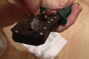 Собственно, сама запрессовка контактов коннектора проводится в специальном гнезде (поз.2). Его конфигурация такова, что коннектор при его вставке до упора встает «как влитой», и ошибиться с его положением – практически невозможно. Большинство кримперов имеют по два, а то и по три гнезда под разные коннекторы. Так, например, можно обжать кабель для проводной телефонной линии (поз.3).