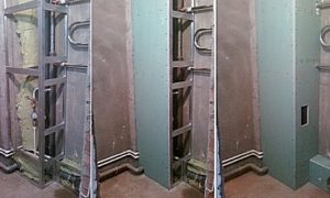 ![]() | При выравнивании стен обычно сразу же монтируется и короб, закрывающий вертикально расположенные трубы стояка. Если же коммуникационные магистрали уже расположены в нише, то ее также рекомендовано закрыть гипсокартоном, закрепив его заподлицо с основной поверхностью стены. |