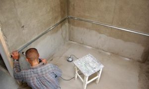 ![]() | Следующим этапом идет выравнивание пола. Перед тем как приступить к этим работам, полы также следует загрунтовать составом, лучше всего – имеющим эффект проникающей гидроизоляции. Когда грунт просохнет, по всему периметру помещения, на стыке пола и стен выставляется демпферная лента, ширина которой должна быть больше толщины будущей выравнивающей стяжки на 25÷30 мм. Этот материал предназначен для компенсации необходимого пространства для застывшего раствора, при его тепловом расширении. Если полы относительно ровные, то для выравнивания пола может быть применен наливной пол с гидроизоляционным эффектом. |