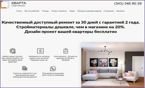 Качественный ремонт за 30 дней с гарантией 2 года. Стройматериалы дешевле, чем в магазине. Дизайн проект вашей квартиры бесплатно. С ценами на услуги компании вы можете ознакомиться здесь — прайс. Чтобы узнать сколько будет стоить ремонт вашей квартиры, нужно заполнить анкету на сайте компании.