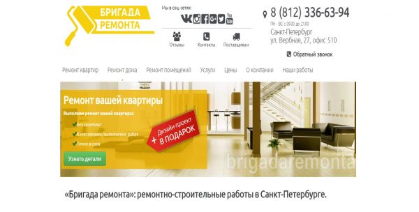 Компания «Бригада ремонта» работает с 2005 года и за это время выполнила, сотни успешных проектов. Главная специализация – ремонт квартир под ключ. С прайсом цен на услуги вы можете ознакомиться здесь (прайс).