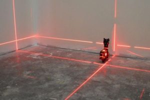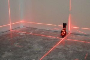- Далее, определяется идеальная горизонтальная линия, которая отбивается на стене по всему периметру комнаты. Она же укажет высоту поднятия лагов в разных областях пола. Как уже говорилось выше, определение высоты перепадов поверхности лучше проводить с помощью лазерного уровня, так как он дает быстрые и наиболее точные результаты. Подойдет и гидравлический – точность результатов тоже на высоте, но времени занимает больше, и требуется помощник.