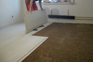 - Покрывной листовой материал — это готовые элементы пола (ЭП), изготовленные из гипсоволоконных плит. Такие ЭП оснащены специально предусмотренными замковыми ламелями, которые ускоряют монтаж и делают покрытие аккуратным. Кроме этого материала, для покрытия засыпки можно применить водостойкую фанеру или древесно-стружечные плиты. Однако, лучшим вариантом все-таки будут гипсоволоконные ЭП, которые имеют оптимальные для настила характеристики: