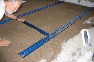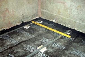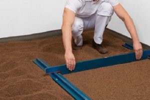 Если выбирается укладка бетонной стяжки, то для ее выравнивания для начала придется выставить маяки на высоту планируемой стяжки, выставив их по уровню.