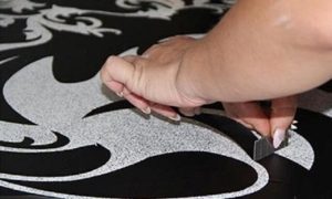 - Второй вариант — это нанесение рисунка акриловыми красками непосредственно на подготовленное основание трафаретным способом. Произвести такое декорирование под силу каждому. Главное — найти подходящий орнамент, перенести его на плотную бумагу или картон и сделать трафарет, через отверстие которого на застывший базовый слой и наносится краска.