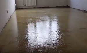 - Если полы пришлось выравнивать стяжкой, то после просыхания ее следует покрыть специальным праймером, то есть еще одним грунтовочным слоем, адаптированным к самому наливному покрытию.