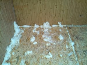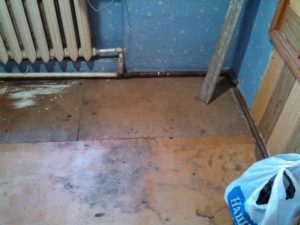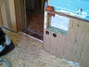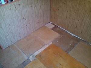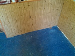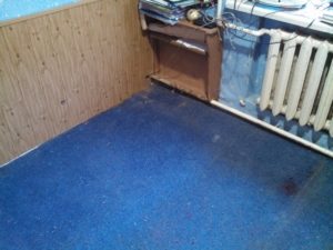 И вот открывшаяся картина – за прошедшее время как-то подзабылось, что прежде чем стелить ковролин, мы дощатый пол обшили фанерой, видимо, чтобы исключить поддувание снизу.