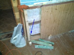 Теперь снимем панели вагонки, чтобы обеспечить продергивание кабеля – прямо под отверстием, чтобы запустить кабель за облицовку, и по месту будущей установки термостата. От отверстия к панельной облицовке выполнена штраба.