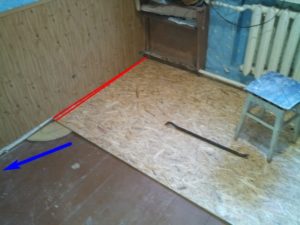 Мало того, и вдоль стены уровень понижения неодинаков – наблюдается уклон в левую сторону, где перепад достигает рекордных 45 мм (в сторону синей стрелки).