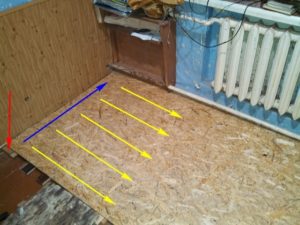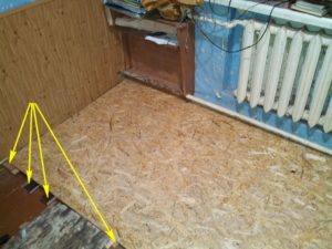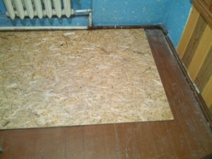 То, на что не обращали особого внимания при ковролине, совершенно недопустимо с ламинатом – для его укладки требуется ровная плоскость. Для выравнивания будут применяется листы ОСП 10 мм («Кроноспан» белорусского производства, класса Е1, то есть вполне подходящие для жилой комнаты).