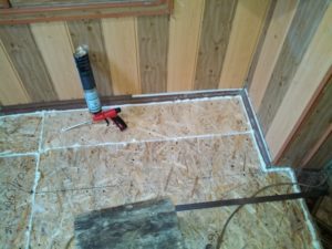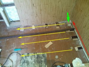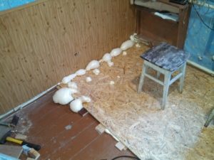 Прежде чем переходить к окончательному выравниванию пола листами ОСП, решено покончить с остальными «грязными» операциями. В частности, это касается прокладки кабеля питания к планируемому месту расположения термостатического регулятора.