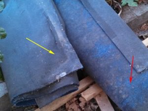 Вот на снимке вынесенный на улицу ковролин. Стрелками показаны участки, где еще сохранилась подложка (желтая стр.) и где она истерлась буквально начисто (красная).