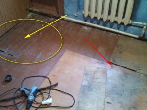 Пол, как уже упоминалось, стабилен и прочен, но очень далек от горизонтальной плоскости. Причем, если в районе входной двери и в направлении окна он относительно ровный, то к левой стене резко «ныряет» вниз – по всей видимости, от усадки этой самой стены.