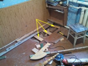 Проблема решена очень просто – набиты перемычки но нижнему обрезу общего дощатого покрытия, а снизу подставлены клинья-упоры. Затем по этим перемычкам перестелены снятые доски.