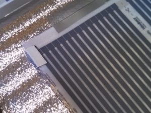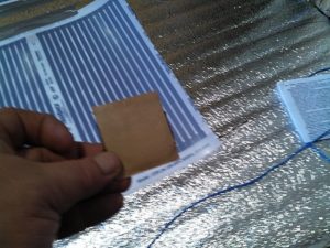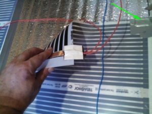 Вначале ставится накладка снизу. Все просто – снимается защитная подложка, и изоляционный фрагмент наклеивается снизу так, чтобы в его «рамки» полностью вошла клемма по всей своей длине и участок нагревательной пленки.