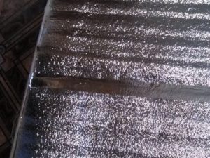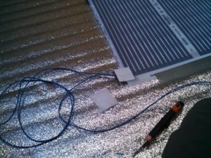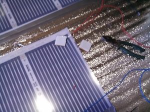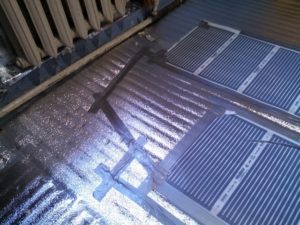 По сути, работы по монтажу инфракрасного плёночного «теплого пола» можно считать законченными и переходить к настилу ламинированного покрытия. По ходу работы было забыто отснять еще одну операцию – необходимо обязательно предусмотреть гидроизоляционный барьер, чтобы в случае случайного разлива воды на поверхности пола она на проникла к нагревательным элементам.