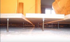 Для работы могут быть использованы металлические шпильки необходимой длины и диаметром в 8 — 10 мм, или же специальные пластиковые регулируемые подставки, фиксирующиеся на основании с помощью дюбель-гвоздя.