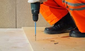 - Если фанера укладывается на клей на бетонную основу, то ее дополнительно зафиксировать будет сложнее. В этом случае необходимо дождаться начала просыхания клея, а затем, просверлив сквозные отверстия, зафиксировать ее дюбелями. Шляпки как саморезов, так и дюбелей должны быть утоплены в древесину – для этого часто заранее зенкуются отверстия.