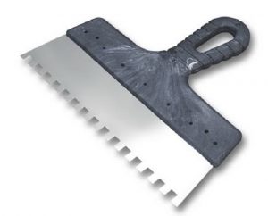 На участок стены для кладки двух-трех плиток наносится клеевая масса, а затем распределяется зубчатым шпателем, придающим раствору рельеф, способствующий созданию равномерного слоя без просветов или полостей.