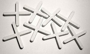 Чтобы сохранить одинаковую ширину швов между плитками, в них вставляется по два пластиковых дистанционных крестика, с каждой из сторон плитки. Крестики остаются в швах до схватывания клея.