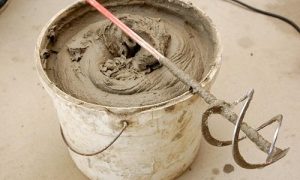 Далее, в емкость с водой постепенно засыпается сухая смесь, при этом производится перемешивание массы с помощью насадки-миксера, закрепленной на электрической дрели. Перемешивать раствор следует до получения полностью однородной массы, которая должна иметь консистенцию густой сметаны. Этот процесс должен занимать не менее 3÷5 минут.
