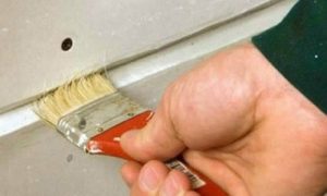 Далее, следует обработать расшитые стыки грунтовочным составом, который свяжет гипсовый слой, благодаря чему он не будет осыпаться во время нанесения шпаклевки.