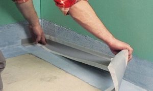 Затем, начиная от угла помещения, на влажный состав приклеивается гидроизоляционная лента, которую следует вдавливать шпателем для удаления воздушных пузырей. В угловой зоне ленту следует наклеить внахлест не менее, чем на 70 мм.