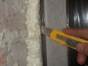 Производить отделку наружных откосов следует сразу после того, как застынет монтажная пена. Ее выступивший излишек срезается с помощью строительного ножа заподлицо с оконной рамой.