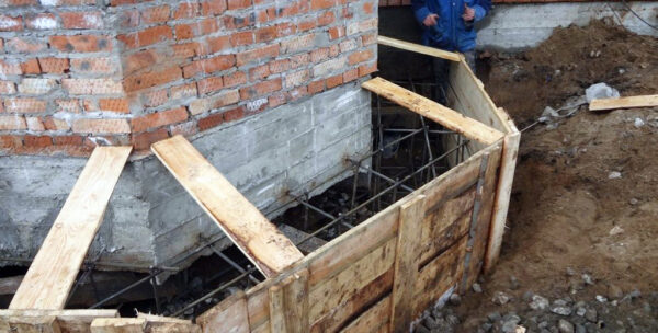 В фундаменте в шахматном порядке под углом в 35-45 градусов пробивают технологические отверстия — шпуры. Отверстия не сквозные, шпуры заканчиваются за 10-15 сантиметров до наружной части стены.