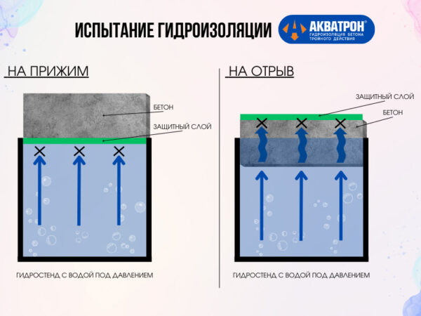 Принцип работы проникающей гидроизоляции бетона «Акватрон-6» наглядно демонстрирует эксперимент, проведенный в лаборатории НИИ эргатических систем (НИИЭС) г. Москва.