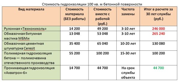 Как видим, стоимость первичной гидроизоляции фундамента проникающими смесями «Акватрон» сопоставима с другими методами (исключая, конечно, дорогую полимерную гидроизоляцию). Но с учетом срока службы ответ на вопрос «Какая гидроизоляция лучше?» становится очевидным.