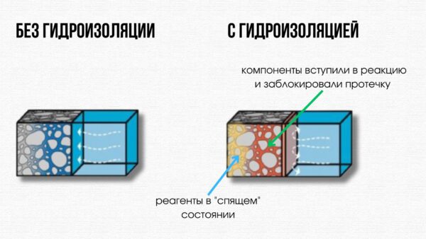 Часть активных компонентов остается в «спящем» состоянии, т. е. они вступят в реакцию только в том случае, если вода проникнет внутрь при механическом повреждении конструкции. Другими словами, бетон с гидроизоляционной добавкой обладает способностью «само-высушиваться», залечивая при этом трещины и восстанавливая целостность и гидроизоляционные свойства.