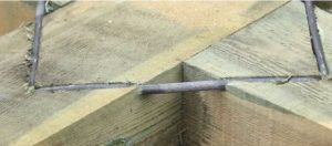- Сначала устанавливается первая внешняя линия доски так, чтобы торец одной из них, в данном случае, стоящей справа, упирался в боковую сторону другой, установленной к первой под прямым углом. Затем их предварительно скрепляют с помощью гвоздей.