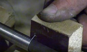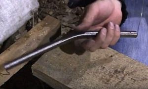 Проволока в данном примере подается через отверстие, просверленное в небольшом отрезке бруса. Подача идет с небольшим натягом, а свободно закрепленная труба прокручивается с помощью установленной в ее торец рукоятки. Как можно видеть, такой «станок» является весьма удобной самоделкой, которая значительно ускоряет работу, и изготовить ее — труда не составит.