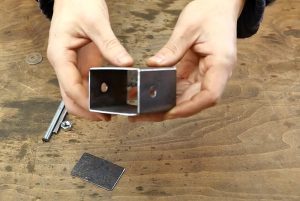 Теперь на противоположных малых стенках корпуса потребуется просверлить отверстия для оси задвижки.