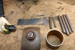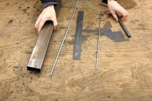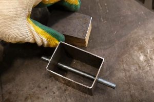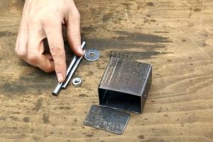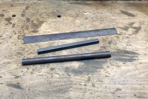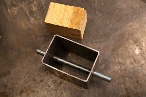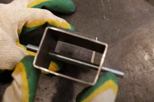 Потребуется небольшой отрезок профильной трубы 60×30 мм, маленький фрагмент стальной пластины толщиной 2 или 3 мм, отрезок шпильки М6 и прутка диаметром 5 мм.