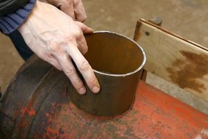 Верхняя пластина (поз. 5) приварена по окружности к баллону, по зачищенному месту реза верхней части. А в центре этой пластины прорезано аккуратное круглое окно диаметром 138÷140 мм, в которое при сборке печи продевается труба нижнего баллона.