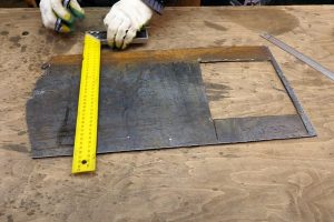 Наконец, на стальном листе желается разметка под вырез прямоугольной задвижки воздушного клапана. Ее размеры примерно 53×23 мм.