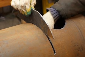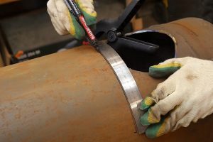 Прямоугольник аккуратно вырезается, его края обрабатываются, при необходимости проводится подгонка размеров под просвет трубы.