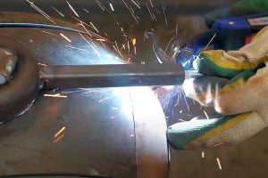 Первым дело ось заслонки заводится в отверстие и выравнивается примерно по центру. К ней предстоит прихватить сваркой заслонку.