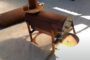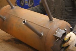 В нижнем баллоне, расположенном горизонтально (поз.1), разместилась камера предварительного горения древесины. Как видно, нижняя часть баллона с полусферическим дном осталась на месте, срезана верхняя часть с горловиной, и этот срезанный фрагмент будет использоваться для монтажа дверцы.